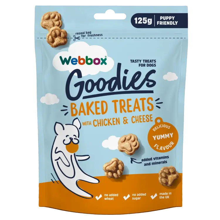 Webbox Goodies Baked Treats are wholesome, oven-baked dog treats designed to deliver great taste with a satisfying crunch. Available in Chicken & Cheese and Turkey & Parsley, these treats are suitable for daily rewarding and are gentle enough for puppies while still appealing to adult and senior dogs.