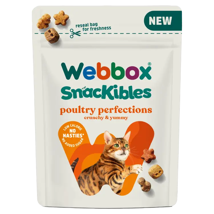 Webbox SnacKibles Poultry Perfections are crunchy, bite-sized treats crafted to deliver irresistible poultry flavour in every bite. Designed for everyday treating, these snacks combine great taste with a satisfying texture that cats love.