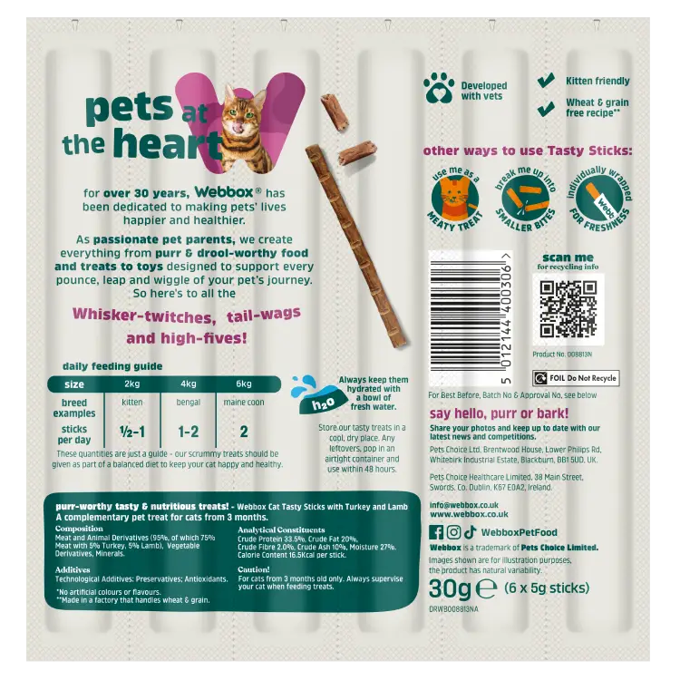 Webbox Tasty Sticks with Turkey & Lamb are soft, meaty treats crafted to give your cat a rich and satisfying snacking experience. Made with a flavorful blend of turkey and lamb, these sticks are designed to be highly palatable, making them perfect for even the pickiest cats.